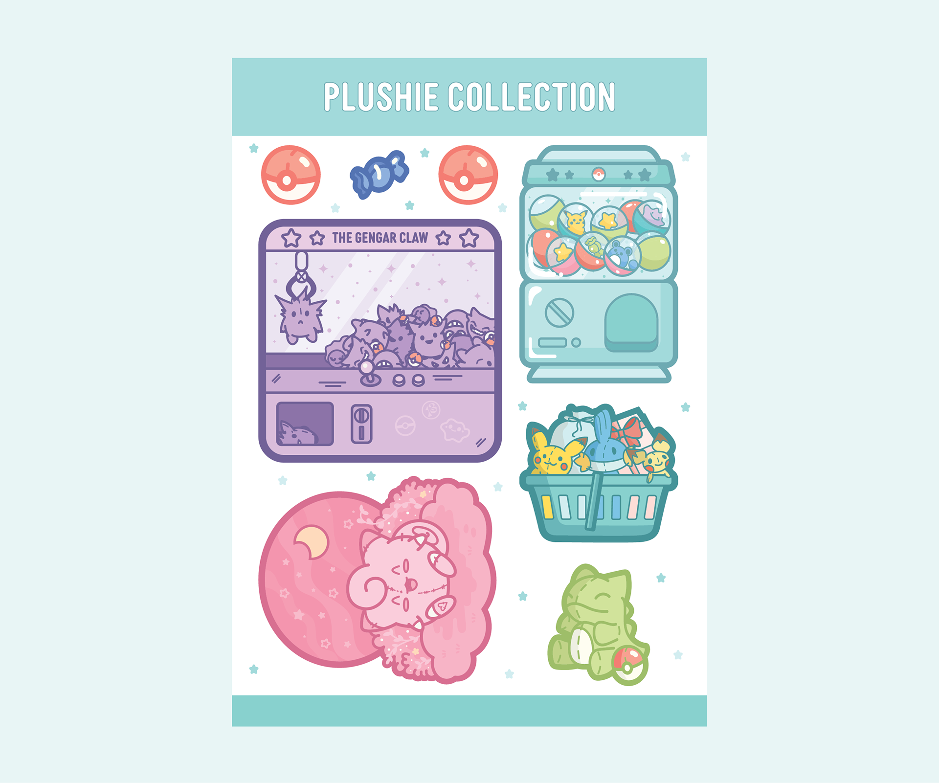 A cute series of stickers I designed for fun, inspired by the department store and plushies in Pokémon Sapphire.